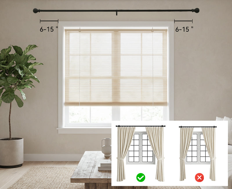 The rod should extend about 6-15" on each edge from the window frame to ensure less light sneaks in and more space for stacking.
