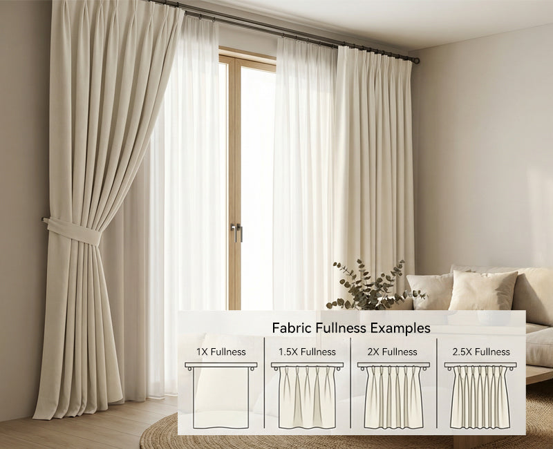 To achieve the desired drape effect, multiply your final measured width by a fullness factor of 150%–200%.